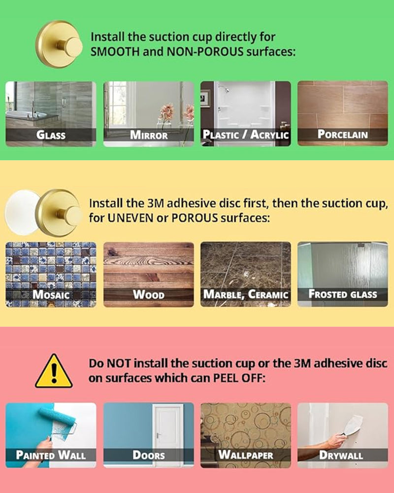 Suction hooks are suitable for flat and non-porous surfaces such as glass, mirrors, marble, ceramics, stainless steel, wood, acrylic, plastics, and laminates.
