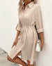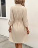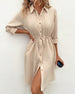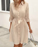 SPECIFICATIONS Style: Casual Material: Cotton Blends Dress Type: Shirt Dress Length: Knee Length Neckline: Shirt Collar Pattern Type: Solid Color Sleeve Type: Regular sleeve Sleeve Length: Long Sleeve Details: Lace Up, Buckle Fit Type: Regular Season: Spring, Summer, Fall Occasion: Daily Package Includes: 1 x Dress SIZE TABLE ...
