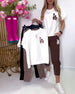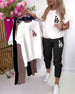SPECIFICATIONS Style: Casual Top Type: T-shirt Category: Sets Material: Cotton Blends Pattern Type: Letter,Print Neckline: Round Neck Sleeve Type: Regular sleeve Sleeve Length: Short Sleeve Pants Type: Pencil Pants Pants Length: 3/4 Long Waist Type: Mid Waist Fit Type: Regular Season: Spring,Summer Details: Pocket,Drawstring Occasion: Daily Pa...