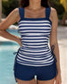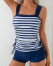 SPECIFICATIONS Style: Vacation Material: 15% Spandex,85% Polyester Occasion: Vacation Pattern Type: Striped Sleeve Length: Sleeveless Top Type: Tankini Bottom Type: Shorts Fit Type: Skinny Details: Lace Up,Drawstring Package Includes: 1 x Tankini SIZE TABLE Size Bust Waist Hip Under bust CM INCH CM INCH CM INCH CM INCH S 88 34.65 73 28.7...