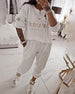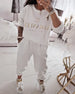 SPECIFICATIONS Style: Sporty Top Type: Sweatshirts Category: Sets Material: Cotton Blends Pattern Type: Letter Neckline: Round Neck Sleeve Type: Dropped shoulder Sleeve Length: Long Sleeve Pants Type: Sweatpant Pants Length: Long Waist Type: Mid Waist Fit Type: Regular Season: Spring,Fall Occasion: Daily Package Includes: 1 x Sweatshirt, 1 x P...