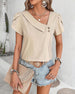 SPECIFICATIONS Top Type: Blouses Style: Casual Material: Cotton Blends Occasion: Daily Neckline: Slant Collar Pattern Type: Solid Color Sleeve Type: Petal Sleeve Sleeve Length: Short Sleeve Fit Type: Regular Season: Spring,Summer Details: Buttons Package Includes: 1 x Blouse SIZE TABLE Size Bust Length CM INCH CM INCH S 97 38.19...