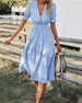 SPECIFICATIONS Style: Casual Material: 5% Spandex,95% Polyester Dress Type: A-Line Dress Length: Midi Neckline: V neck_V Pattern Type: Striped, Print Sleeve Type: Puff Sleeve Sleeve Length: Short Sleeve Details: Buttons Fit Type: Regular Season: Spring, Summer, Fall Occasion: Daily Package Includes: 1 x Dress SIZE TABLE Size Bust...