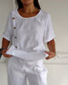 SPECIFICATIONS Top Type: Tops Style: Casual Material: Cotton and linen Occasion: Daily, Vacation Neckline: Round Neck Pattern Type: Solid Color Sleeve Type: Regular sleeve Sleeve Length: Short Sleeve Fit Type: Regular Season: Spring, Summer, Fall Details: Buttons Package Includes: 1 x Top SIZE TABLE Size Bust Length CM INCH CM INCH S ...
