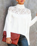 SPECIFICATIONS Top Type: Tops Style: Chic Material: Spandex,Polyester Occasion: Daily Neckline: High Neck Pattern Type: Solid Color Sleeve Type: Dropped shoulder Sleeve Length: Long Sleeve Fit Type: Regular Season: Spring,Fall Details: Patchwork,Lace Package Includes: 1 x Top SIZE TABLE Size Bust Length CM INCH CM INCH S 97 38.19...