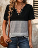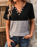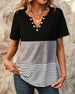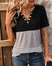 SPECIFICATIONS Top Type: T-shirt Style: Casual Material: Cotton Blends Occasion: Daily Neckline: V neck_V Pattern Type: Striped,Color Block Sleeve Type: Regular sleeve Sleeve Length: Short Sleeve Fit Type: Regular Season: Spring,Summer Details: Buttons Package Includes: 1 x T-shirt SIZE TABLE Size Bust Length CM INCH CM INCH S 9...
