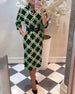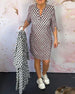SPECIFICATIONS Style: Casual, Business Material: 5% Spandex, 95% Polyester Dress Type: A-Line Dress Length: Knee Length Neckline: V neck_V Pattern Type: Geometric Print Sleeve Type: Lantern Sleeve Sleeve Length: 3/4 Sleeve Details: Patchwork Fit Type: Regular Season: Spring, Summer, Fall Occasion: Daily, Work Package Includes: 1 x Dress SI...
