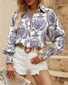 Retro pattern print lantern sleeve blouse