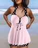 SPECIFICATIONS Style: Vacation Material: 15% Spandex,85% Polyester Occasion: Vacation Neckline: Halter Pattern Type: Polka Dot,Color Block Sleeve Length: Sleeveless Top Type: Tankini Bra Type: Wireless Bra Bottom Type: Shorts Fit Type: Skinny Season: Summer Details: Patchwork,Tie Side Package Includes: 1 x Tankini SIZE TABLE Size Bust W...