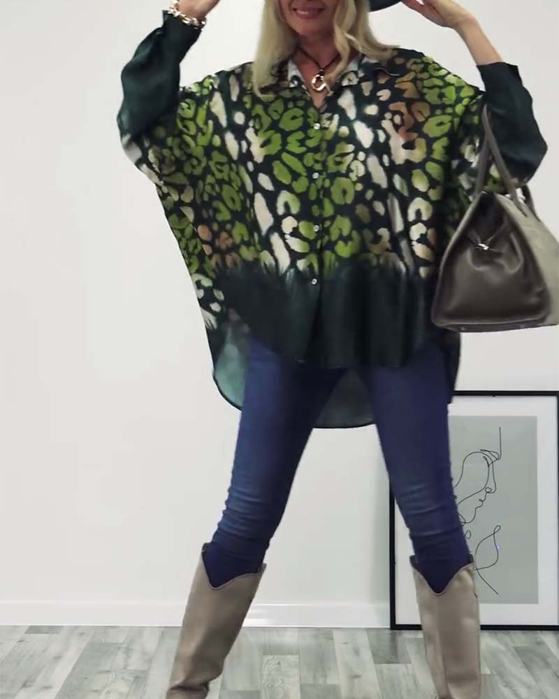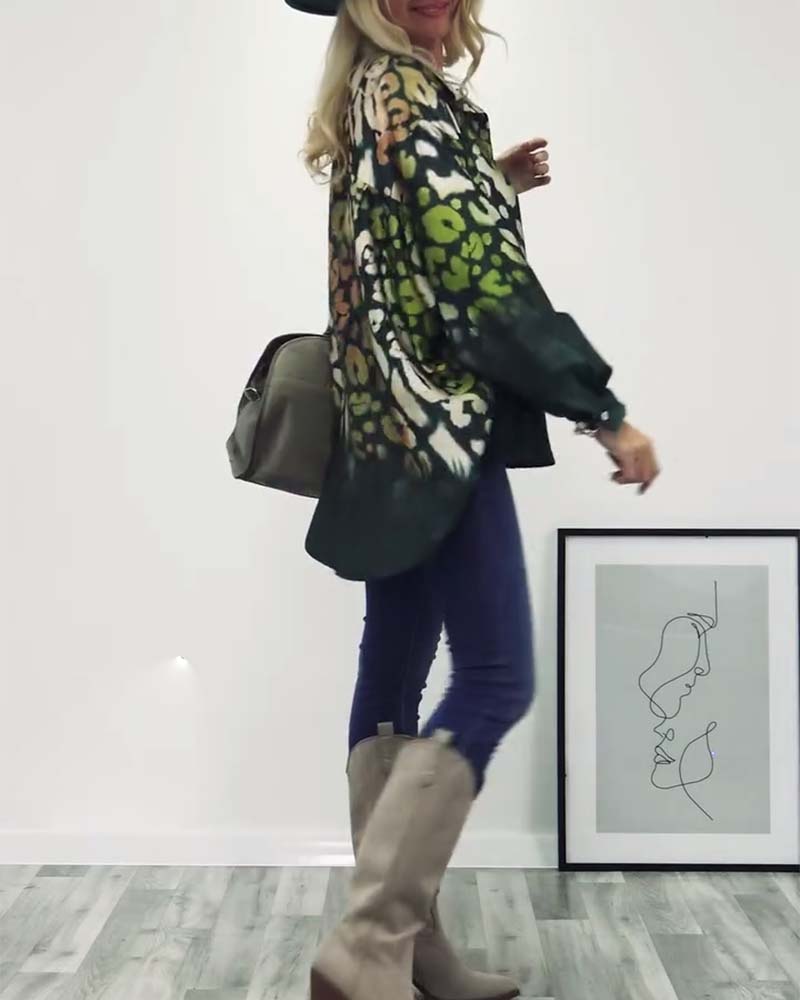 Leaf print V-neck buttoned nine-quarter sleeves casual blouse