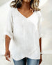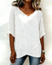 SPECIFICATIONS Top Type: Tops Style: Casual Material: 80% Cotton, 20% Linen Occasion: Daily Neckline: V neck_V Pattern Type: Solid Color Sleeve Type: Regular sleeve Sleeve Length: 3/4 Sleeve Fit Type: Regular Season: Spring,Summer Details: Irregular Package Includes: 1 x Top SIZE TABLE Size Bust Length CM INCH CM INCH S 97 ...