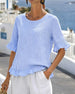 SPECIFICATIONS Top Type: Blouses Style: Casual Material: Cotton Blends Occasion: Daily Neckline: Round Neck Pattern Type: Striped Sleeve Type: Ruffle Sleeve Sleeve Length: Half Sleeve Fit Type: Regular Season: Spring,Summer Package Includes: 1 x Blouse SIZE TABLE Size Bust Length CM INCH CM INCH S 97 38.19 65 25.59 M 101 39.76...