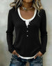 SPECIFICATIONS Top Type: Tops Style: Casual Material: Cotton Blends,Lace Occasion: Daily Neckline: V neck_V Pattern Type: Color Block Sleeve Type: Regular sleeve Sleeve Length: Long Sleeve Fit Type: Regular Season: Spring,Fall Details: Lace,Fake two pieces Package Includes: 1 x Top SIZE TABLE Size Bust Length CM INCH CM INCH S 92 36.2...