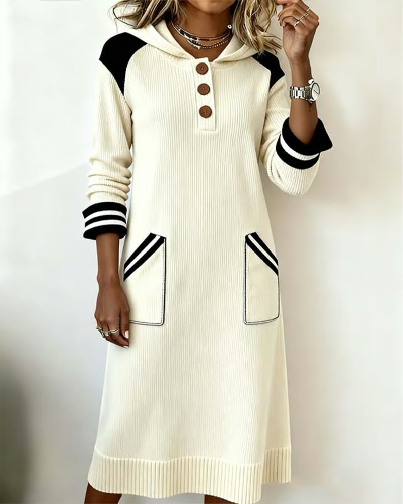 SPECIFICATIONS Style: Casual Material: Knit Dress Type: Hoodie Dress Length: Knee Length Pattern Type: Color Block Sleeve Type: Dropped shoulder Sleeve Length: Long Sleeve Details: Buttons,Drawstring Fit Type: Regular Season: Fall,Winter Occasion: Daily Package Includes: 1 x Dress SIZE TABLE Size Bust Length CM INCH CM INCH S 97 ...