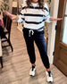 SPECIFICATIONS Style: Casual Top Type: Sweatshirts Category: Sets Material: Cotton Blends Pattern Type: Striped Neckline: Round Neck Sleeve Type: Dropped shoulder Sleeve Length: Long Sleeve Pants Type: Conventional Pants Length: Long Waist Type: Mid Waist Fit Type: Regular Season: Spring,Fall,Winter Details: Pocket Occasion: Daily Package Incl...