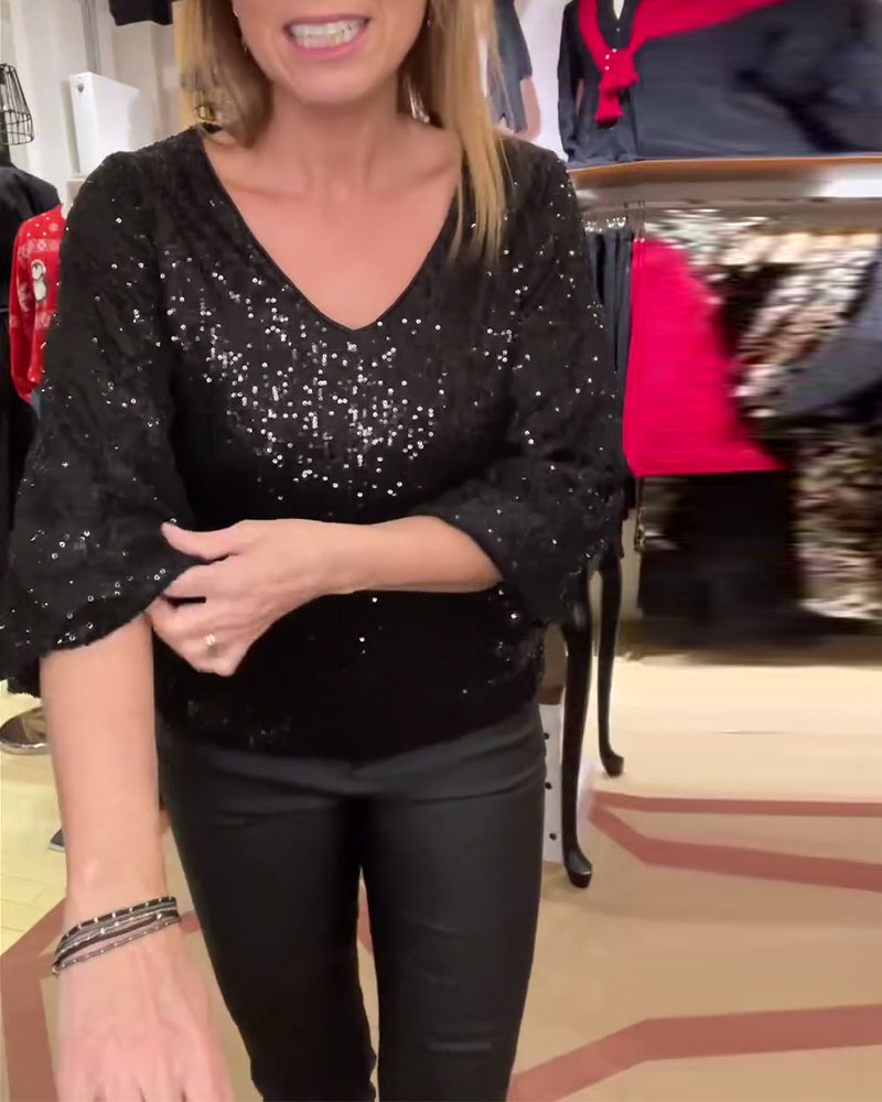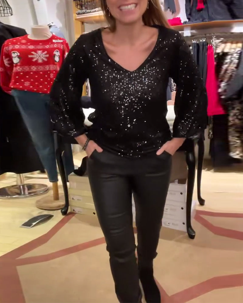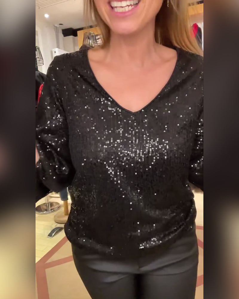 SPECIFICATIONS Top Type: Tops Style: Casual Material: Cotton Blends Occasion: Daily Neckline: V neck_V Pattern Type: Sequin Sleeve Type: Regular sleeve Sleeve Length: Long Sleeve Fit Type: Regular Season: Fall,Winter Package Includes: 1 x Top SIZE TABLE Size Bust Length CM INCH CM INCH S 97 38.19 65 25.59 M 101 39.76 66.5 26.1...