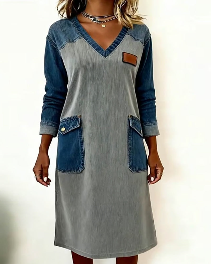 Fashion Denim Patchwork V-Neck Dress