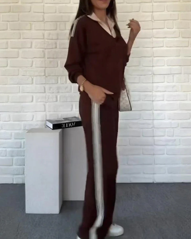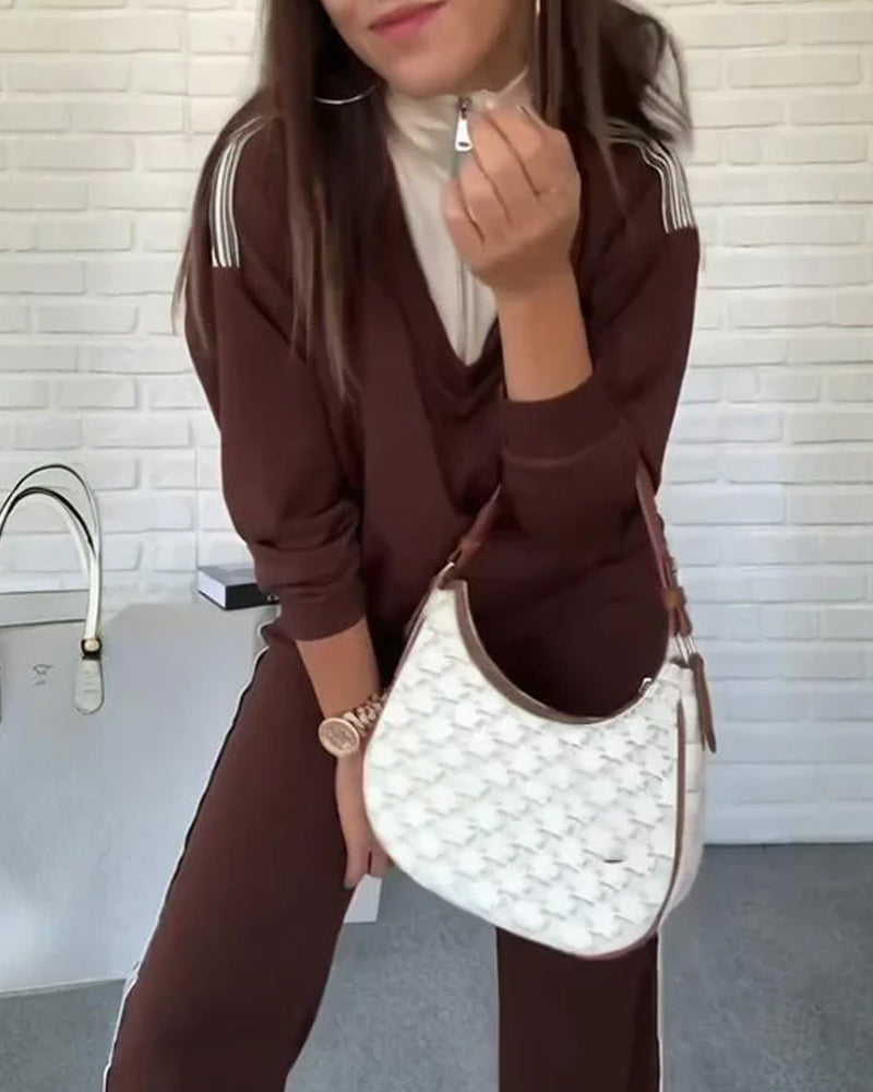 Fashionable Contrast Color V-Neck Long-Sleeved Top