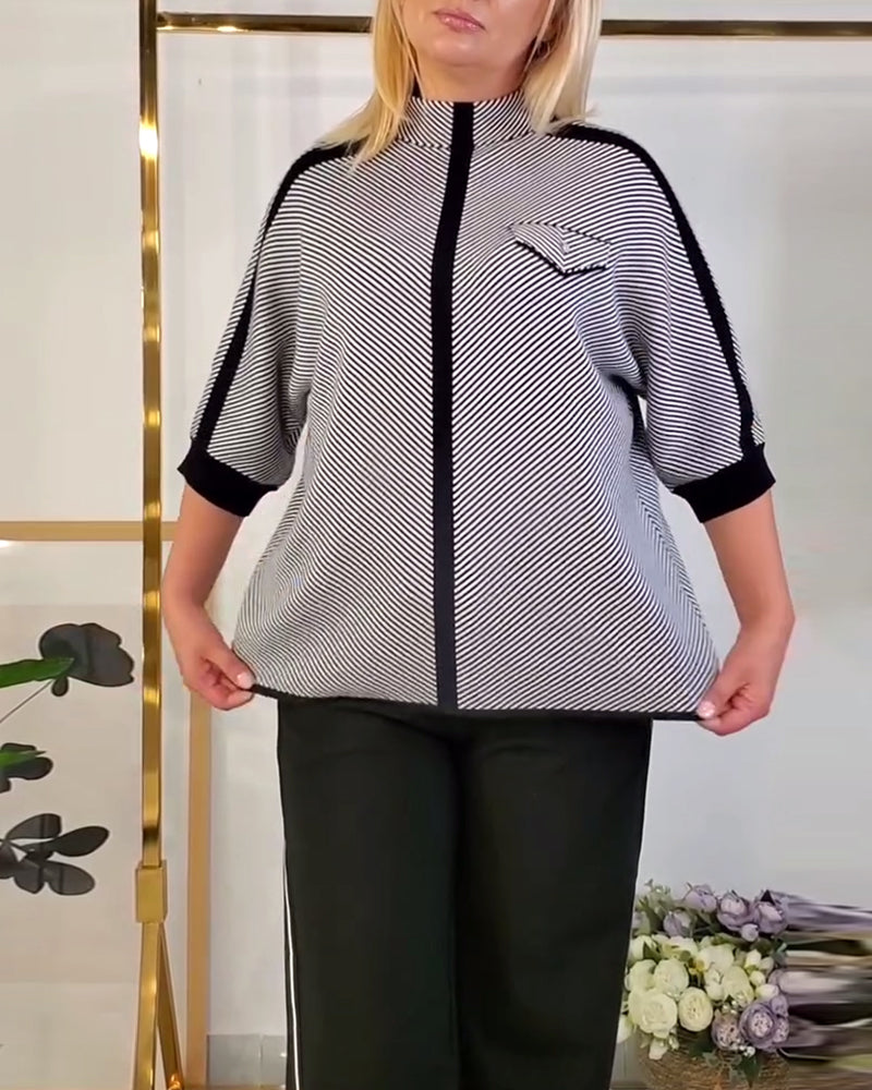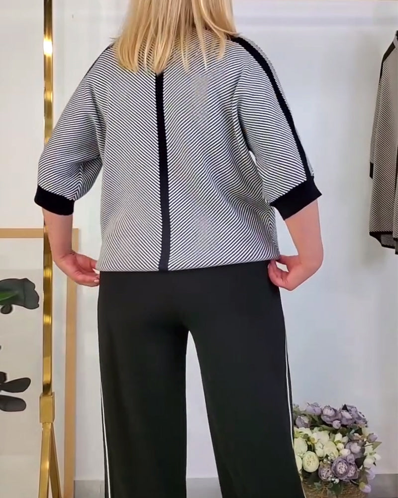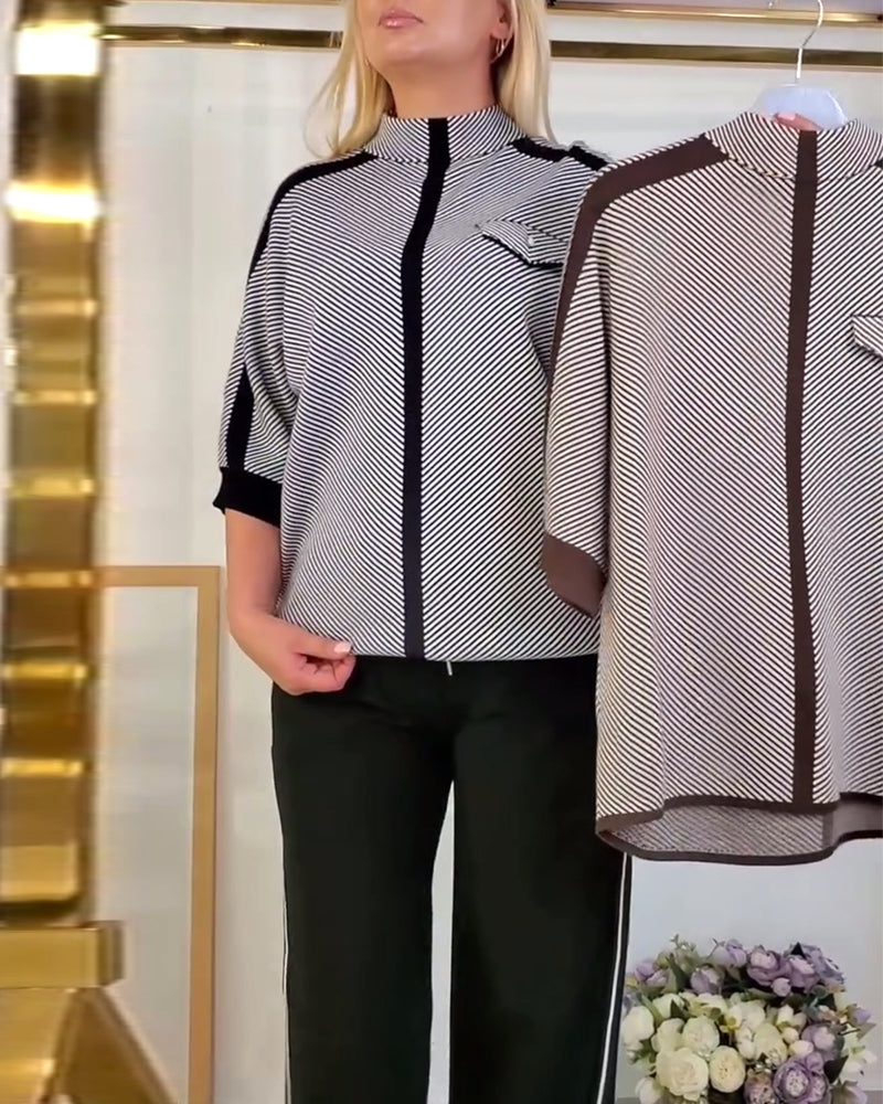 Horseshoe Sleeve V-Neck Contrast Color Top