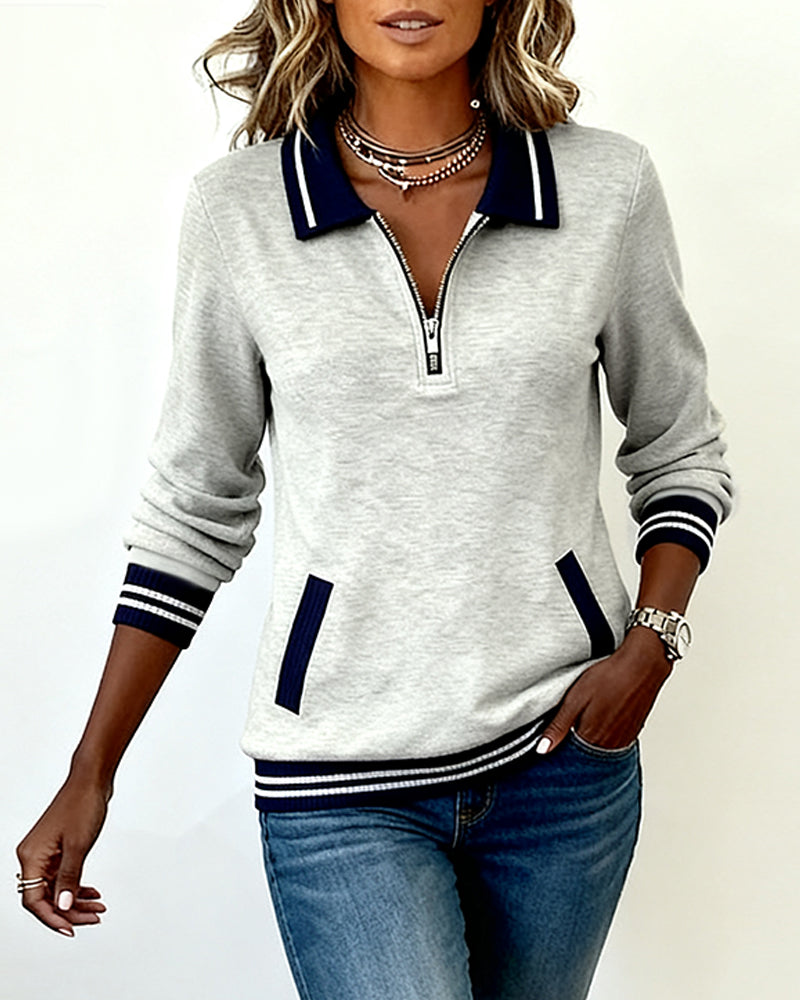 Lapel Contrast Color Stitching Sweatshirt