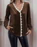 SPECIFICATIONS Top Type: Blouses Style: Casual Material: Lace,Velvet Occasion: Daily Neckline: V neck_V Pattern Type: Solid Color Sleeve Type: Regular sleeve Sleeve Length: Long Sleeve Fit Type: Regular Season: Spring,Fall,Winter Details: Patchwork,Buttons Package Includes: 1 x Blouse SIZE TABLE Size Bust Length CM INCH CM INCH ...