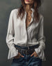 SPECIFICATIONS Top Type: Blouses Style: Chic Material: Cotton Blends Occasion: Daily Neckline: Shirt Collar Pattern Type: Solid Color Sleeve Type: Ruffle Sleeve Sleeve Length: Long Sleeve Fit Type: Regular Season: Spring,Fall,Winter Details: Ruffle Package Includes: 1 x Blouse SIZE TABLE Size Bust Length CM INCH CM INCH S 97 38....