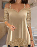 SPECIFICATIONS Top Type: Tops Style: Casual Material: Cotton Blends,Sequins Occasion: Daily Neckline: V neck_V Pattern Type: Sequin,Solid Color Sleeve Type: Regular sleeve Sleeve Length: 3/4 Sleeve Fit Type: Regular Season: Spring,Fall,Winter Details: Patchwork Package Includes: 1 x Top SIZE TABLE Size Bust Length CM INCH CM INCH ...